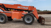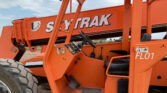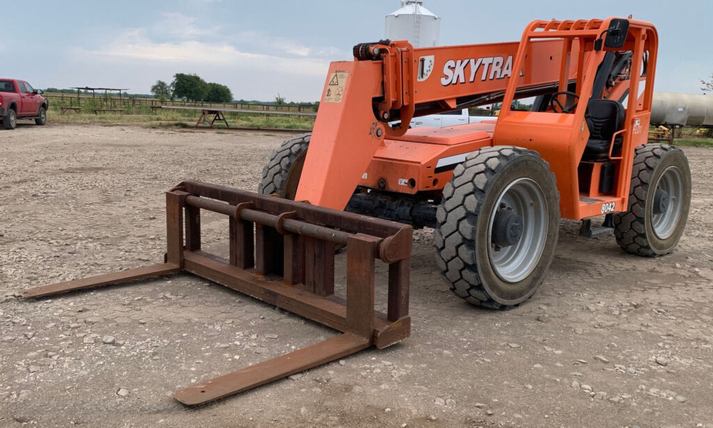 The 2014 JLG 8042 telehandler has 871 hours and is powered by a 3.261L Cummins QSB3.3 diesel engine with a Powershift transmission (4 forward, 4 reverse) and four-wheel drive. It features a canopy, crab and four-wheel steering, and a maximum lift capacity of 8,000 lbs with a 42′ lift height and 3-stage boom. The telehandler includes 48″ forks, auxiliary hydraulics, a tilt carriage, hydraulic leveling, and a manual quick attach. It is equipped with foam-filled 370/75-28 tires and an 8,000 lbs counterweight.