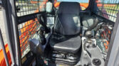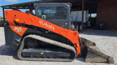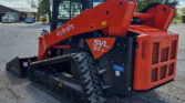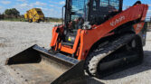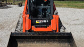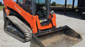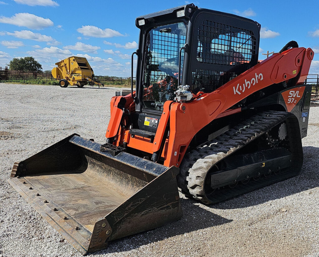 The 2021 Kubota SVL97-2 skid steer loader has 204 hours and is powered by a 3.8L Kubota diesel engine with a hydrostatic transmission. It features an enclosed cab with AC and heat, and hand-controlled bucket operation. The loader includes auxiliary hydraulics with high flow, an auxiliary electrical outlet, and a hydraulic quick coupler. It has an 80″ low-profile AP-HD80LLC bucket with a bolt-on cutting edge. The machine is equipped with 18″ Bridgestone tracks.